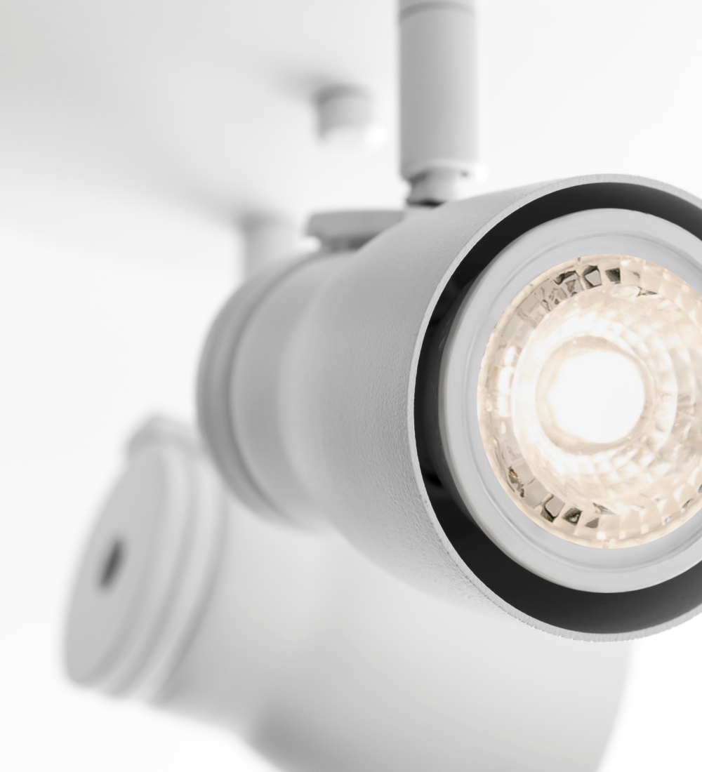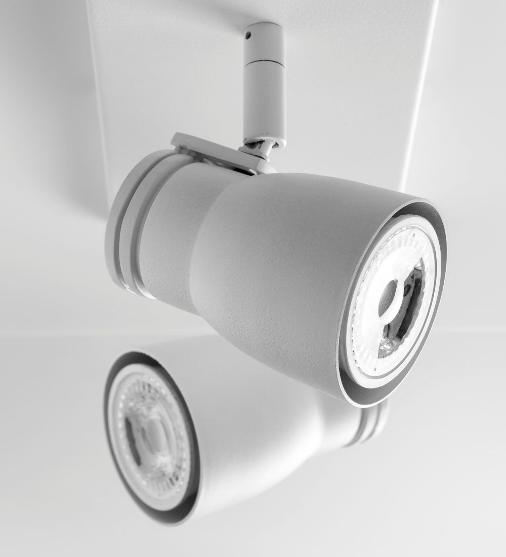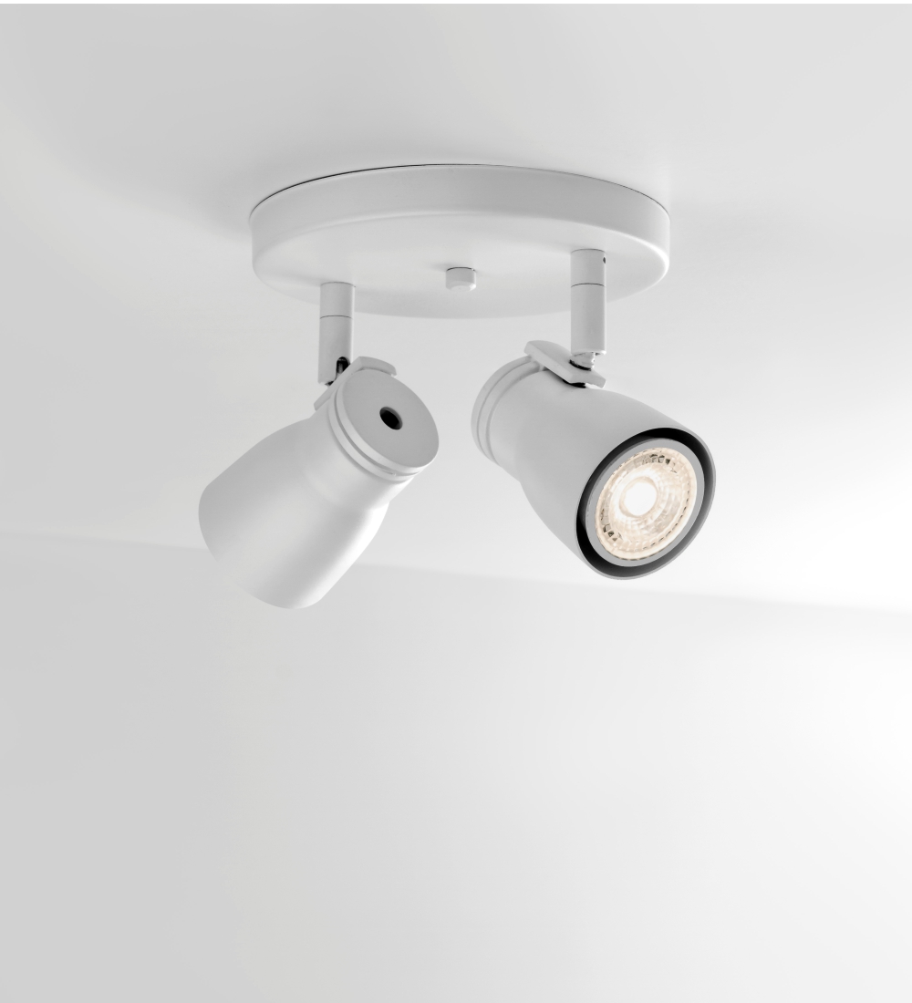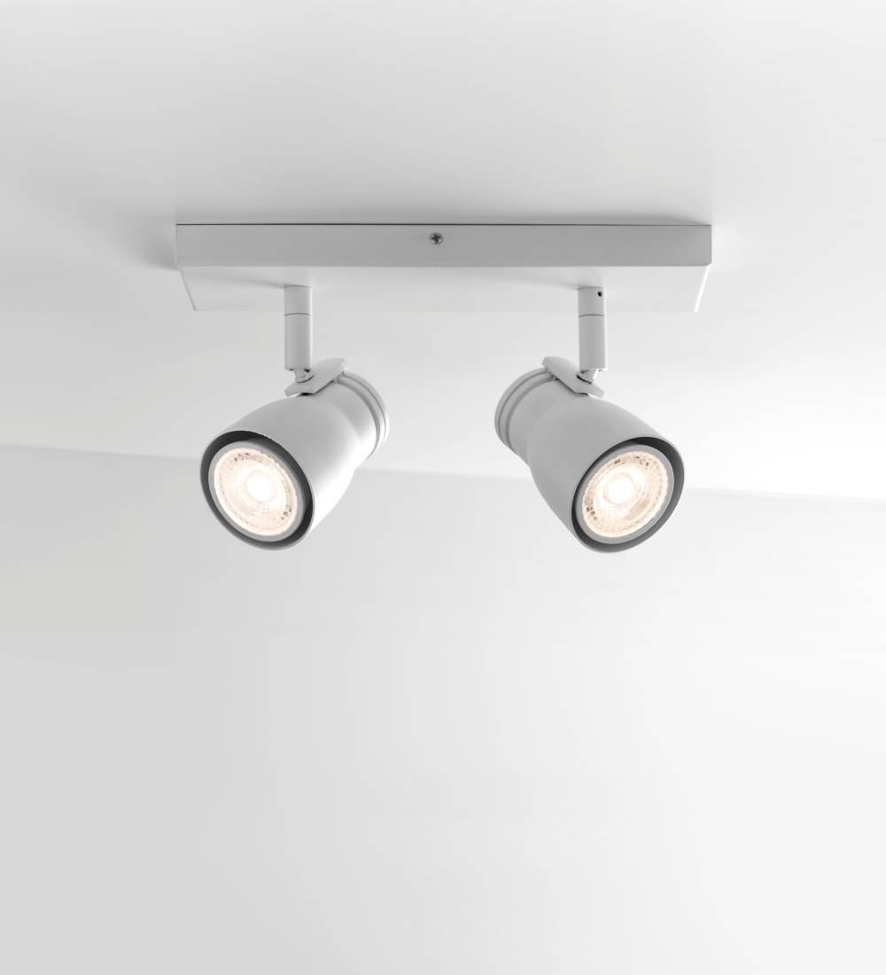Aplique / Plafón de 2 luces orientables. Con pantalla metálica y base rectangular o circular. Iluminación general.